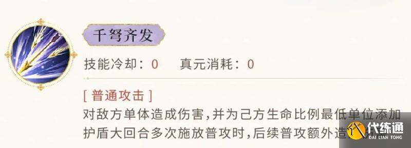 蒙恬的普通攻击不仅对敌方单体造成伤害,还会为我方生命值最低的单位附加护盾。该技能具有成长性,在同一大回合内多次触发时,后续攻击的伤害会逐步提升,使他在持久战中能打出可观的累计输出。