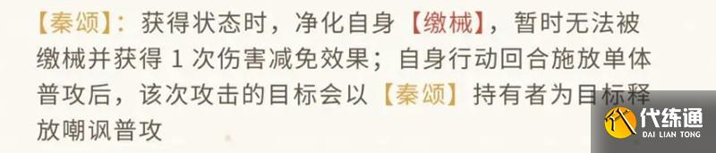 这是蒙恬的核心特性技能,可以主动为我方单位赋予"秦颂"状态并触发一次普攻。当蒙恬受到攻击时,会自动对攻击者发动反击。蒙恬自身常驻"秦颂"状态,拥有缴械免疫和伤害减免效果,大大提升了生存能力。