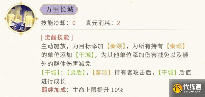 觉醒技能为指定目标添加"秦颂"状态,同时让所有"秦颂"持有者获得"干城"护盾。这个护盾具有成长性,每次攻击后盾值都会提升,配合群体减伤效果,使队伍在持久战中越战越勇。