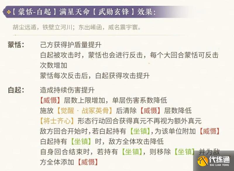与赢政搭配时,蒙恬能为赢政提供额外保护和伤害加成,使赢政的攻击方式转变为更具针对性的弹射模式。与白起组合则形成强力防御反击体系,白起受到攻击会触发蒙恬的反击,同时白起自身攻击力会不断提升。