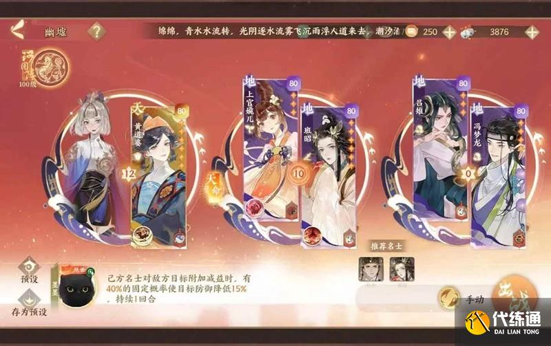 实战方面因为端华只有十级所以不是每次都能稳过(名士有退场或开局三个名士血量低于一半或开局免死被打出都要退出去重来),优先给两个小怪叠毒(小怪死了首领才会开始扣血),冯梦龙减攻首领,流血叠满注意换目标,优先给婉儿套盾
