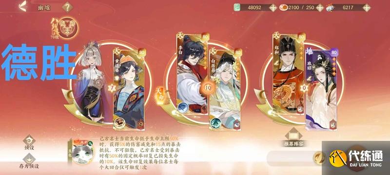 1、德胜:只要撑过前两回合就够了,这关梁红玉和嬴政的爆发不是很高。万能婆婆可以加盾保命,阵法选八卦有奇效