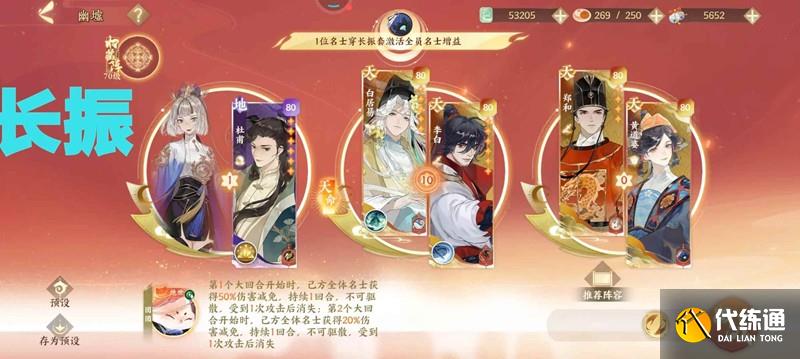 4、长振:带穿捭阖的李师师或者杜甫,婆婆的猫二技能也可以净化所以我带了婆婆,阵法选归藏阵