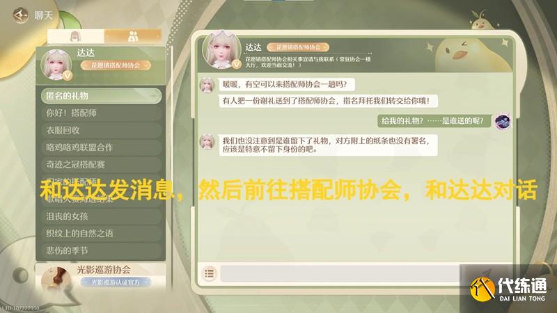 完成后,打开美鸭梨,和达达发送消息,前往搭配师协会找到达达,询问关于匿名礼物,获得一个感谢信;