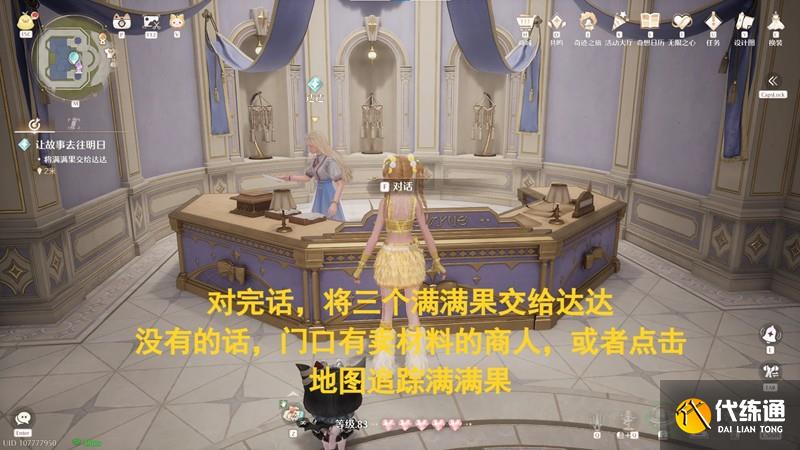 然后向后转,看到菲比,与菲比对话;对完话,前往搭配师协会,向达达申请场地;然后将满满果交给达达(没有的话点击地图追踪满满果或者在搭配师协会门口广场大树周围的花坛里有满满果)