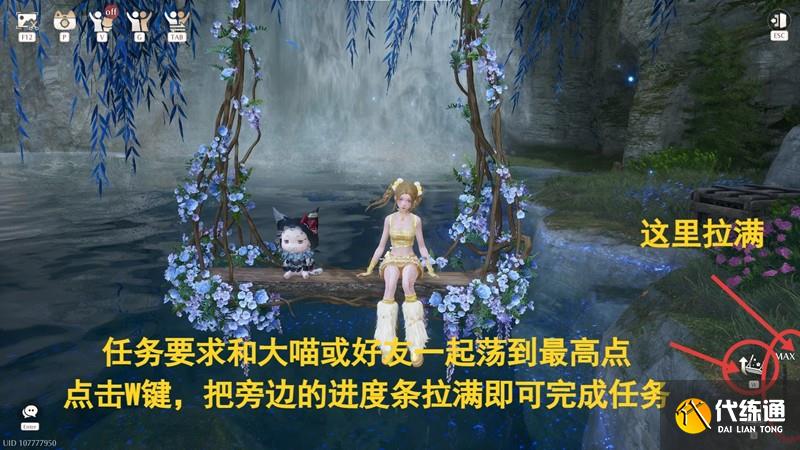 传送过去,坐上秋千,点击上面的按键,PC端是V键出现大喵一起,G键是邀请好友一起;出现大喵和好友后,再按右边的键位,PC端按W键,把旁边的进度条拉满就是荡到最高点。