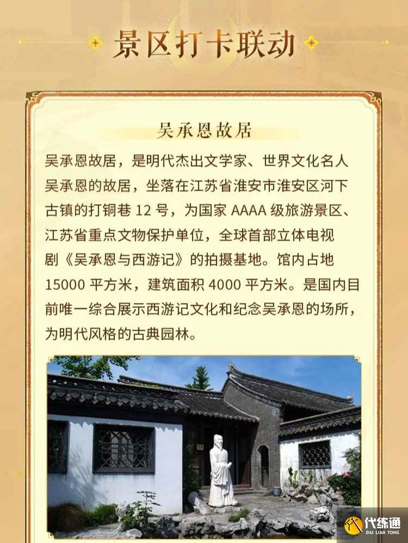 1、前往吴承恩故居实地打卡,并出示游戏内名士谱的吴承恩页面,可领取吴承恩喵摇摇乐1个。