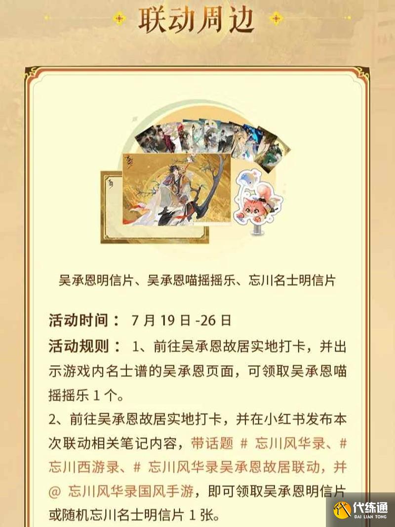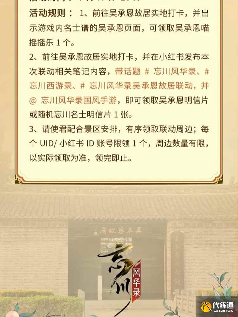 2、前往吴承恩故居实地打卡,并在小红书发布本次联动相关笔记内容,带话题 #忘川风华录、#忘川西游录、#忘川风华录吴承恩故居联动,并@ 忘川风华录国风手游,即可领取吴承恩明信片或随机忘川名士明信片1张。