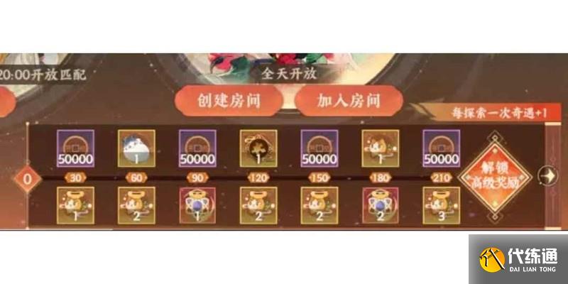 1.进入到山河密藏匹配和创建房间的页面。右下方有一个长条任务,这个是以探索次数作为任务,探索积累到一定次数的时候,就可以领取下方的奖励。