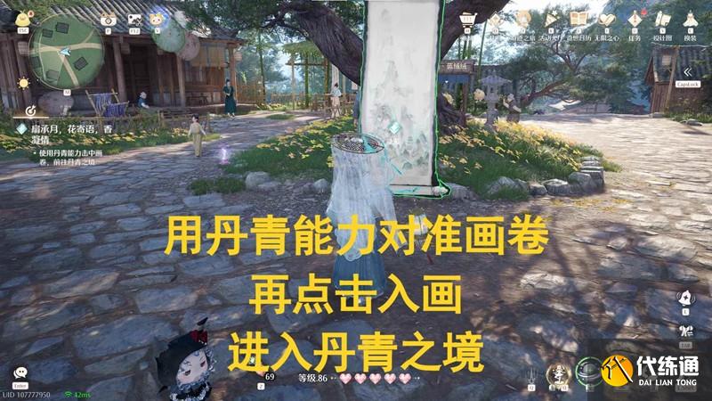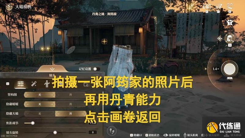 之后寻找画卷,用丹青能力入画,进入丹青之境;进入丹青之境后,跟着指引,拍一张阿筠的家;拍完后,再次点击入画,返回将绘制好的团扇交给风萦萦;
