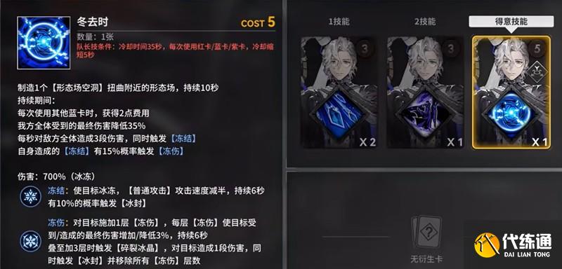 伊利亚德的队长技能冬去时拥有35秒冷却时间,但通过使用红卡、蓝卡、紫卡可以缩短冷却。该技能能够制造形态场空洞,扭曲附近形态场干扰敌人。使用蓝卡时还能获得费用回复,同时降低我方全体受到的伤害。技能效果包含每秒对全体敌人造成3段伤害并附加冻结效果。