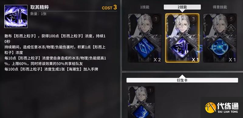 2技能取其精华通过释放形而上粒子为自身提供伤害增益效果。该增益适用于冰冻、物理和负能伤害,并能分享给队友。当形而上粒子浓度达到要求时,还能获得潮海生卡片,增加战术选择空间。