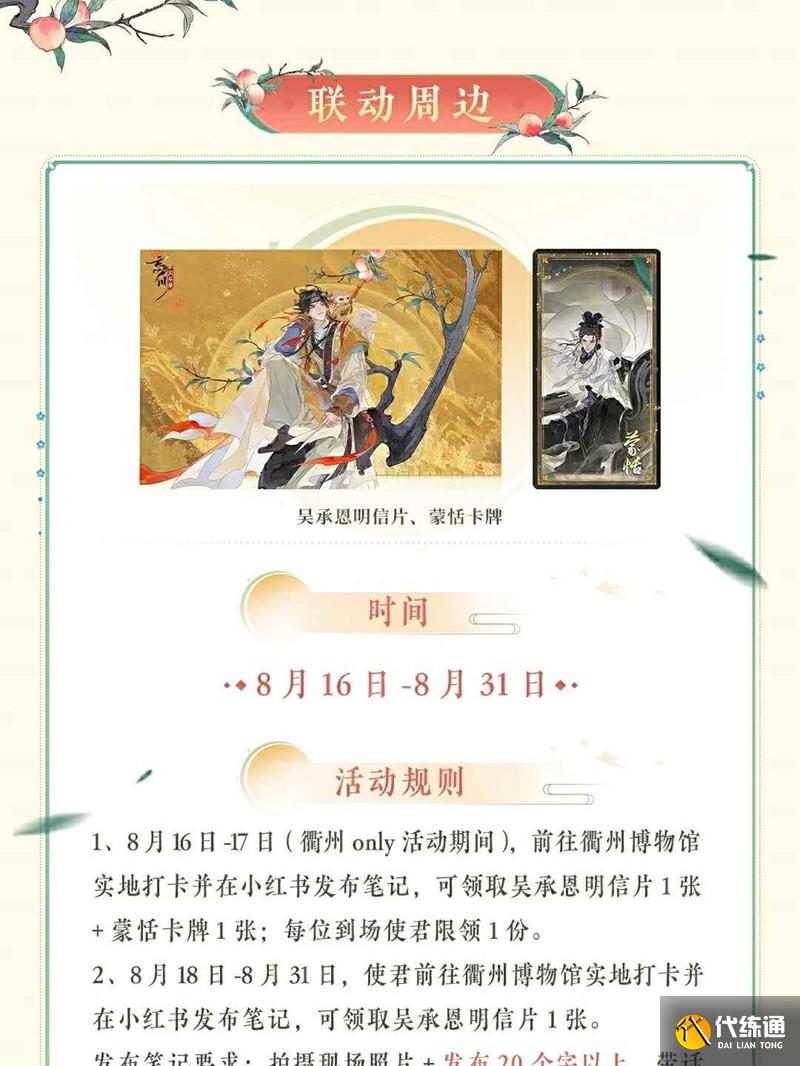 1、8月16日-17日(衢州only活动期间),前往衢州博物馆实地打卡并在小红书发布笔记,可领取吴承恩明信片1张+蒙恬卡牌1张;每位到场使君限领1份。