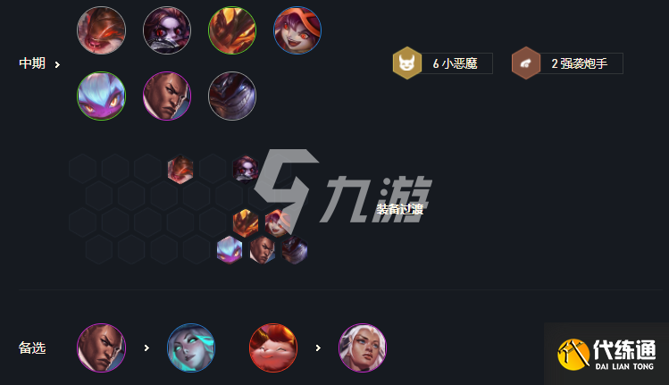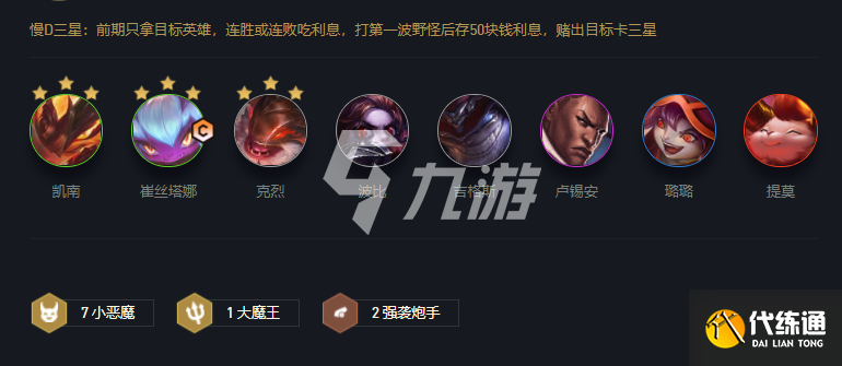前期就拿小恶魔牌,连胜或者连败吃利息,3-2拉6开始D卡,凯南和小炮两星以及凑出6恶魔,之后存钱卡利息D出小炮和凯南三星,然后拉人口补枪手卢锡安或是女枪。