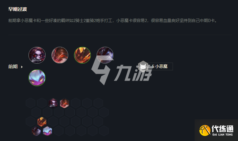前期拿小恶魔卡和一些好凑的羁绊如2骑士2重骑2炮手打工,小恶魔卡很容易2,很容易血量良好坚持到自己中期D卡。
