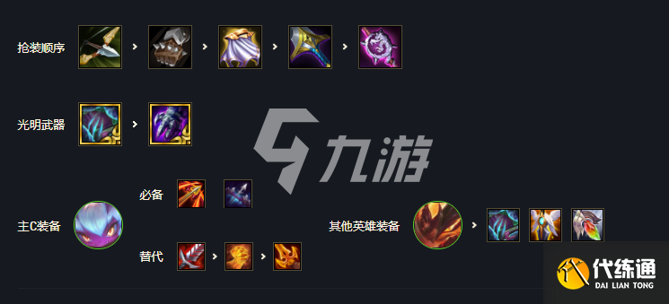 然后在装备分配上,主要是给小跑飓风和穿甲弓,第三件可以给小炮饮血,正义或者是杀人剑,凯南可以给复活甲和鬼书,或者是救赎。