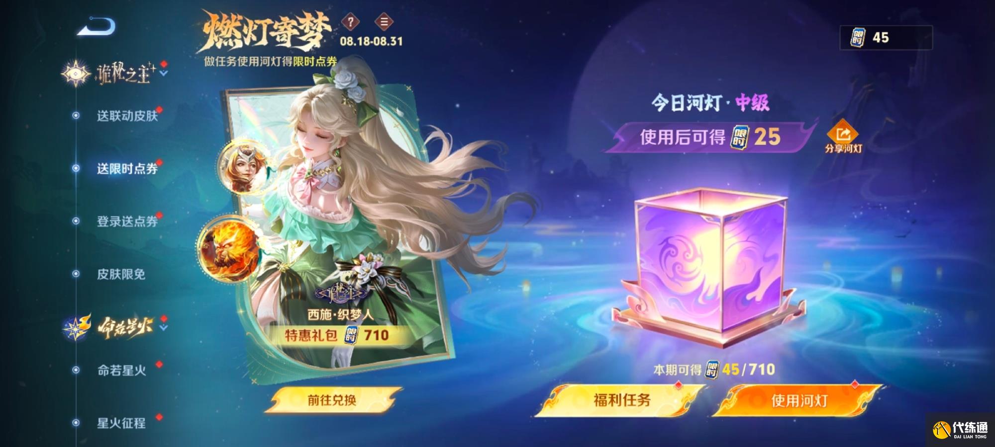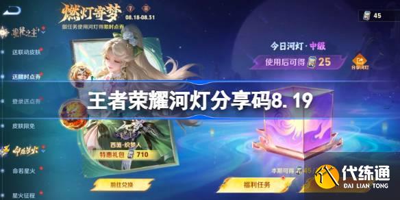 王者荣耀开启了燃灯寄梦活动,可以获得限时点券。在活动中玩家可以完成活动来获取一定的限时点券,通过其他玩家分享的河灯分享码可以获得更多的点券。那么王者荣耀河灯分享码有哪些呢?下面一起来看看王者荣耀河灯分享码大全8.19吧。