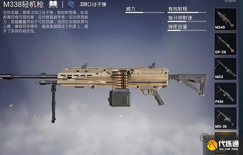 在当前版本的游戏里,MG3、M249同属于空投中的轻机枪,而M338则拥有更远的有效射程,能够在中远距离对敌人形成有效压制,并且使用专属的.338子弹赋予了极强的载具穿透能力,光子称其是名副其实的“载具杀手”,对热爱摇车打法的玩家必须尝试!