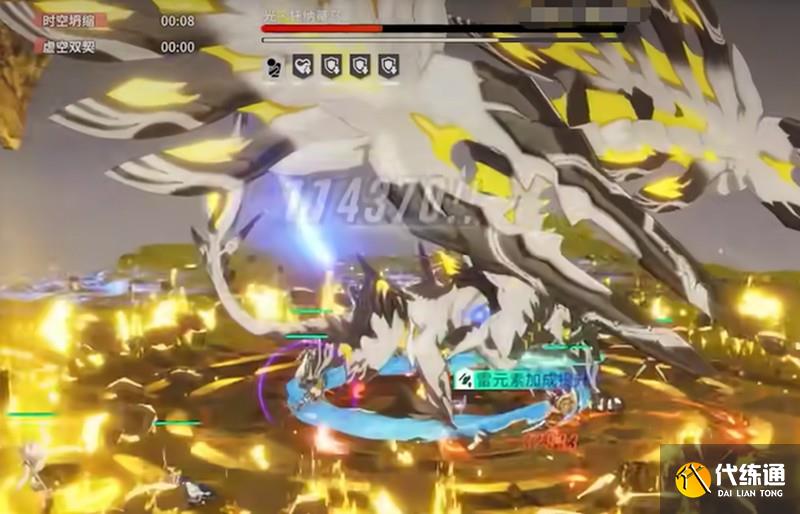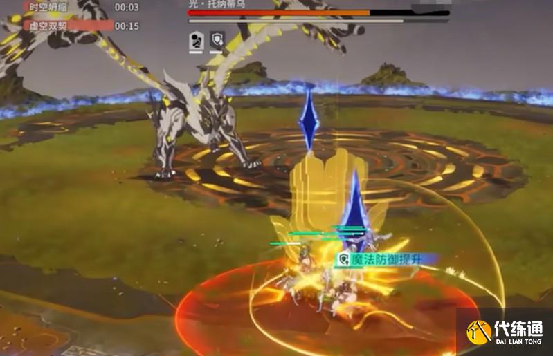 “时空的终焉”是光托纳蒂乌的蓄力技能,释放后会对全场造成范围爆炸,伤害随距离衰减。为了避免被击中,建议站在左右两侧的空岛下方。爆炸后,玩家会被冲击力推至空岛上方,从而安全地继续输出。这一机制需要提前站位准备,确保团队成员都能顺利转移。