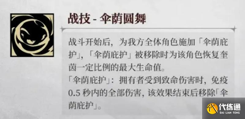 奎茵的战技“伞荫圆舞”进一步强化了她在团队中的辅助定位。该技能可以为队友提供“伞荫庇护”效果,在遭遇致命伤害时,能够短暂免疫一次伤害。一旦该效果被触发,奎茵还能为自己恢复一定比例的生命值。这种机制在面对高爆发敌人时尤为关键,能够让队友在濒死边缘获得一线生机,同时也能让奎茵在战斗中保持较高的续航能力。