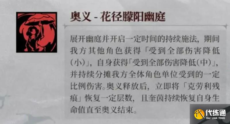 奎茵的奥义“花径朦阳幽庭”是她最具战略价值的技能之一。释放后,她会在战场上生成一个持续存在的幽庭区域。在该区域内,奎茵自身获得更强的伤害减免效果,同时队友所受到的伤害也会被显著降低。此外,她还会在奥义持续期间持续恢复生命值,并分摊队友所受到的伤害。这种机制让她在面对群体攻击或高难度Boss时,能够有效提升整个队伍的存活率。