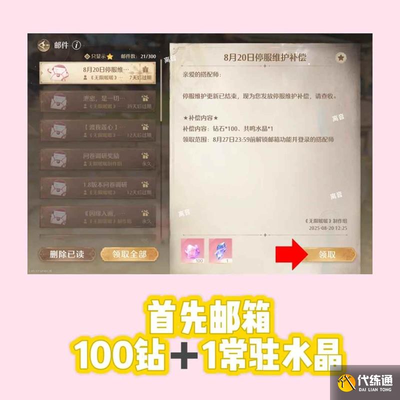 上线,首先去领取一下邮件!100钻!1常驻水晶!