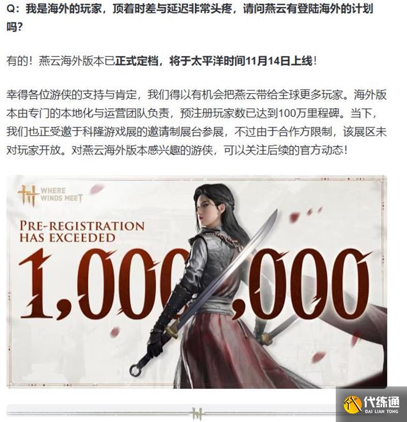 答:燕云海外版本已正式定档,将于太平洋时间11月14日上线!