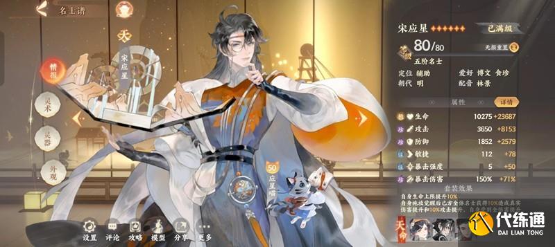 装备方面宋应星首推风荷(天命开局满真元,可以p1开大直接触发风荷增伤),其次承佑/沧浪也可以使用,衣帽主词条生命,鞋子武器爆伤,配饰攻击加成,武器洗敏捷。
