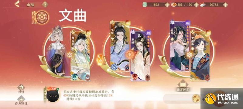 文曲:感觉是比踏破还难的一集我凹了一天才通关,这个有点讲究运气了 这个阵容能保证生存,这关韩非和于谦觉醒的伤害量特别吓人,低练度要留两个生存位,接下来毒的伤害就看天意了,李师师治疗一下群体5w单体10w[呃R]因此先集火李师师,偶数回合和尚的金钟罩电死人,低练度不要上群攻,并且放技能的时候绕开金钟罩,点在没有金钟罩的名士身上,班昭的觉醒和吕雉的特性不要在有金钟罩的时候用