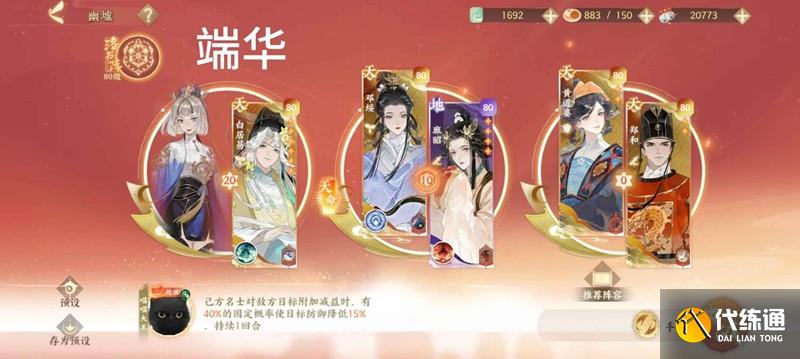 端华:依旧是班邓郑和的核心思路,记得带婆婆,集火大怪,大概在8回合9回合左右会开一次大,己方如果没有名士退场大怪会掉很多血,然后再去打小怪
