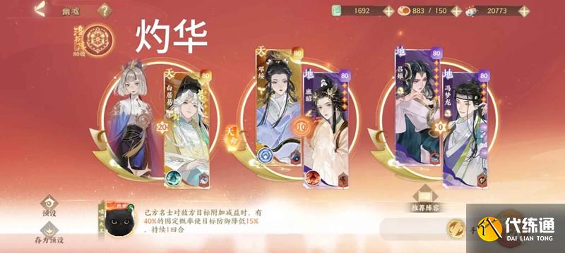 灼华:没有灼华套的神秘阵容,因为机制问题还是采用毒队思路,复盘试了一下9回合通关,依旧是先集火夫差,因为老陶毒起来很厉害可以带捭阖套,这关还是很好过的