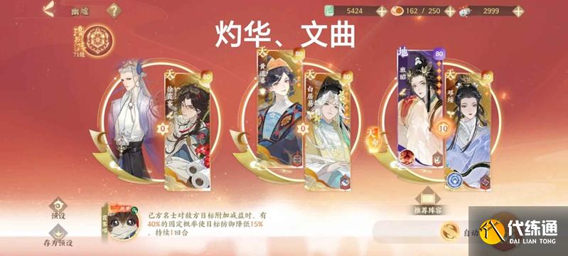 戚继光/徐霞客穿李白的重蕴文曲套。自动,先打李师师,再打韩非/于谦,保证于谦第九回合前锁血。本周试了下把戚继光换成徐霞客,感觉容错率更高,主要是可以给全体上毒,压全体的血量,只靠班昭普攻2人/大招3人太随机,很容易韩非或者于谦其中一个血量压不下来。