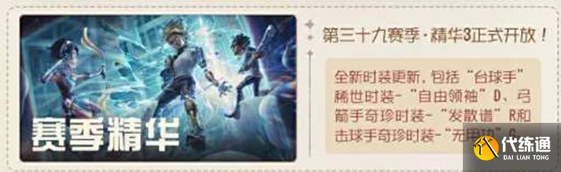 ●本周第三十九赛季·精华3正式开放,全新时装更新,包括“台球手”稀世时装-“自由领袖”D、弓箭手奇珍时装-“发散谱”R和击球手奇珍时装-“无用功”G。在抽取精华次数达到80/130次时,可在【头像】弓箭手-“发散谱”R/【头像】击球手-“无用功”G中任选其一获得;当抽取次数达到180次时,则可获得【头像】“台球手”-“自由领袖”D。