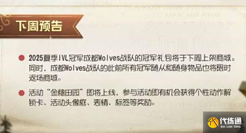 ●2025夏季IVL冠军成都Wolves战队的冠军礼包将于下周上架商城。同时,成都Wolves战队的此前所有冠军随从和随身物品也将限时返场商城。