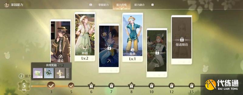 在能力升级那边领取3级的奖励,就可以回掌握能力那边再三选一解锁一个能力(采星/养鱼/动物邀约都可以,具体选哪个主页另一篇有详细分析)另外每天可以最多获得100家园心得,可以再选一个能力升到2级(不建议优先升建造能力,先升其他能赚钱的能力好一些)up推荐升种植