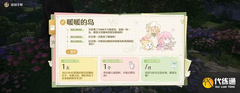 园宝收购就是把种的东西卖钱,目前不建议急着卖可以等等攻略。家园手帐里面可以改岛名,以及随进度领很多万象星实。乐园构想在美鸭梨或者右上角按钮打开,蓝钻解锁送一个家具+设计图+双倍代币,完成一定任务后蓝钻全额返还。
