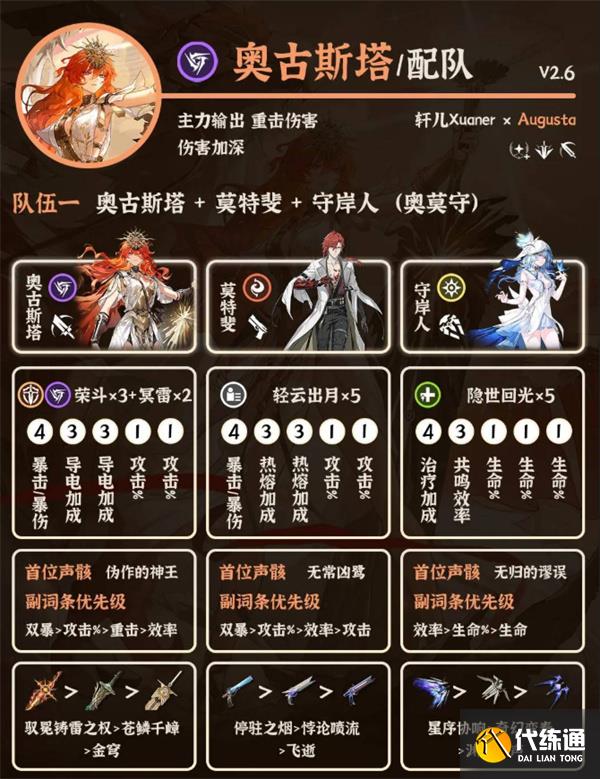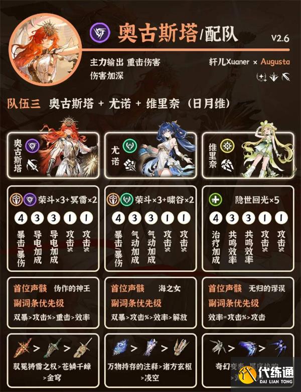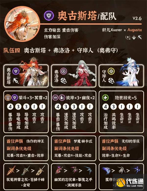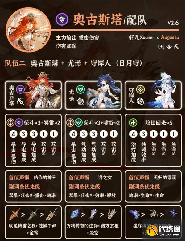 思路:莫特斐提供高额重击加成,搭配轻云套专心辅助奥古斯塔即可,养成压力相对较低。后续如果抽到尤诺,可以直接替换莫特斐。