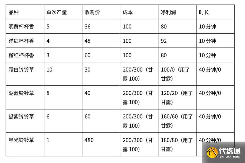 不用减少1小时的甘露加速情况下,杯杯香10分钟一块地净利润是80-92。铃铃草40分钟一块肉的净利润是100-180。