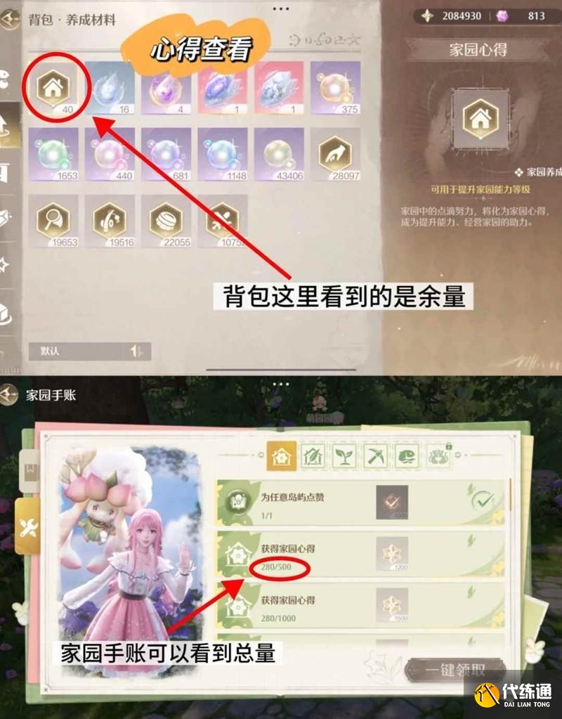 100上限/日,解锁家园第1天是180,后面每天+100;心得用于提升家园能力等级,获得「能力使用许可」+其它奖励,「能力使用许可」可以解锁新的家园能力