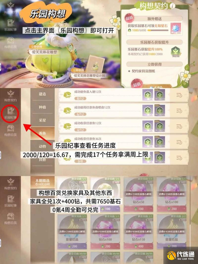 2000上限/周,基石用于兑换家具/钻石/噗灵/丝线/泡泡等;通过完成不同的建造/种植/采星/养鱼等任务获取,可在乐园纪事中查看具体任务