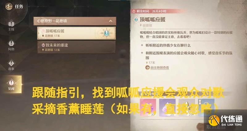 采摘香薰睡莲,如果有,直接和维瓦乔对话,没有的话,点击地图追踪,在白天的湖边花才会开放;