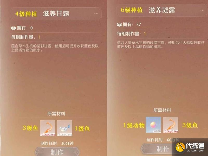 ②:3级养鱼如图可以制作滋养甘露/凝露,可以速刷低等级作物;