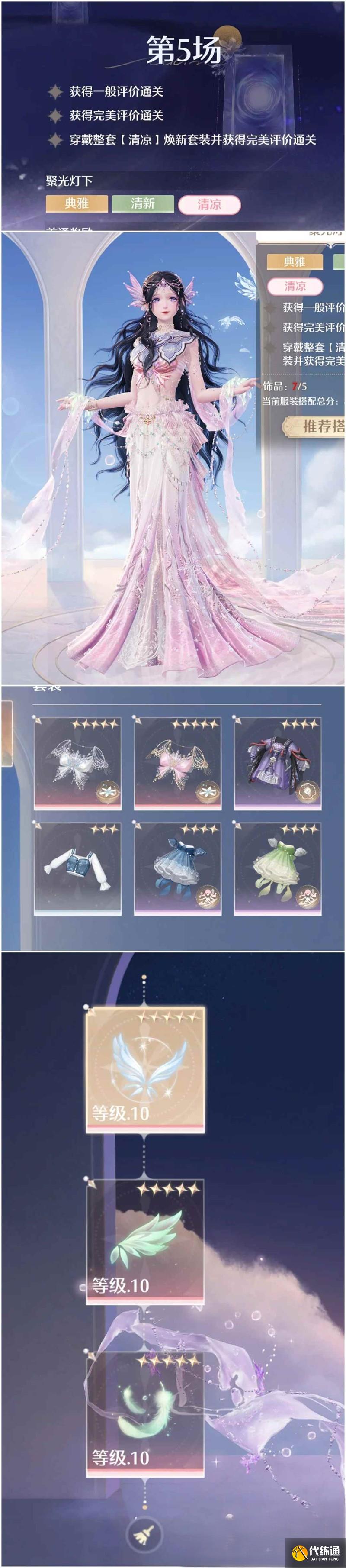 第五关 典雅 清新 【清凉】 这一关需要穿一整套焕新且带【清凉】标签的衣服才能完美通关,人鱼,龙套陪跑四星,初始漂浮套满足此要求,祝福闪光推荐光之羽。