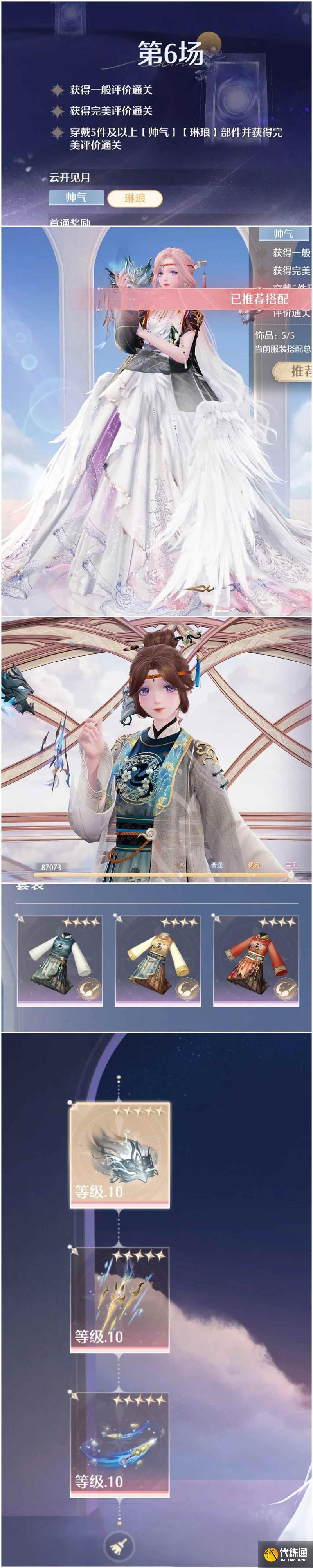 第六关 帅气 琳琅 本关需要穿五件带有【帅气】【琳琅】标签的衣服才能完美通关,丹青套 龙套满足要求,散件有 1.8花粉钻买的小书生的背挂,只穿丹青套也可三星,祝福闪光推荐墨影。