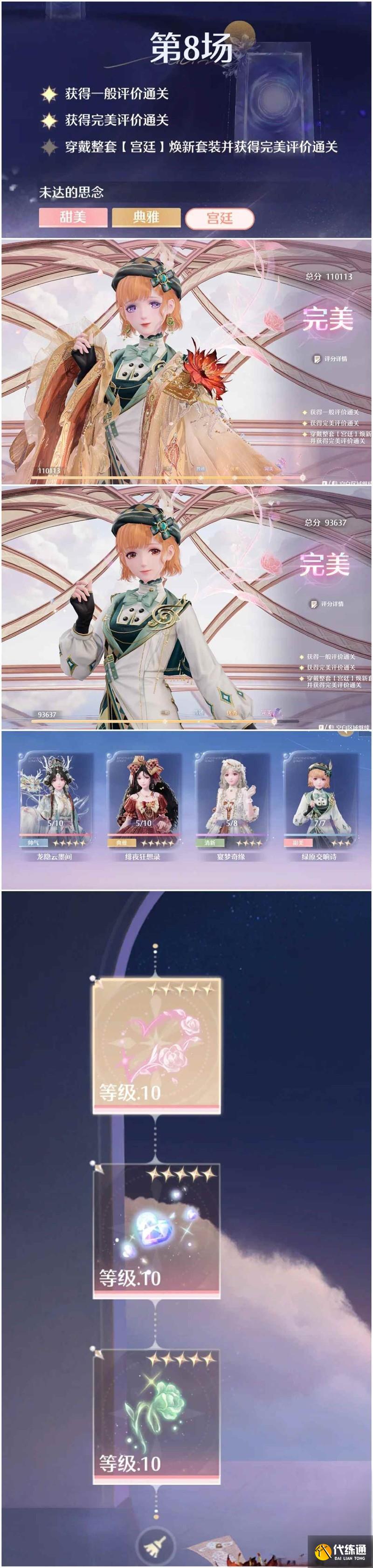 第八关 甜美 典雅 宫廷 这一关要求穿整套【宫廷】标签的焕新套装才能完美三星,推荐大家去焕新此次家园【动物邀约】能力套,替大家试过了,不穿其他,单穿一整套配合祝福闪光可以三星通关,非常经济实惠;其他的套装分别是:玩偶套,龙套,宴席白牛套【宴梦奇缘】携带有【宫廷】标签,祝福闪光推荐瑰爱。