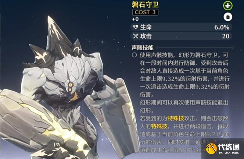 磐石守卫的属性设定较为特殊,具备高防御与反击能力。当受到攻击时,能够通过衍射机制将部分伤害返还给攻击者,这种被动反击效果在面对高输出敌人时尤为有效。同时,该声骸的技能具备打断敌方特殊动作的特性,能够在关键时刻打乱对手节奏。由于其COST值为3,在声骸系统中属于中高消耗单位,因此更适合在角色练度有一定基础后使用,以发挥最大战斗效能。