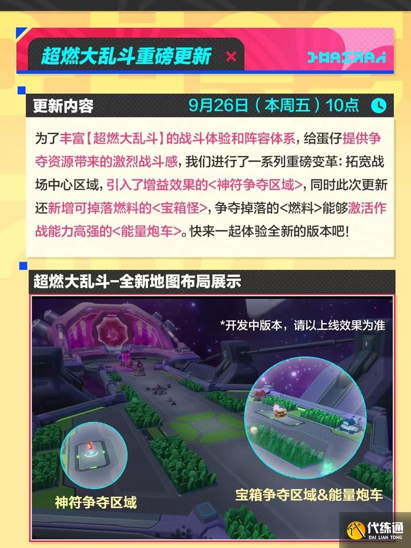 答:蛋仔派对的超燃大乱斗模式即将在本周五(9月26日)10点正式上线,此次更新增加了更多的策略元素,让每一场战斗都充满了不确定性和挑战性。玩家们可以期待在新的地图布局中展开激烈的争夺战,利用神符和能量炮车的优势,带领队伍走向胜利。