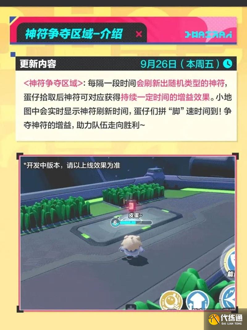神符争夺区域是蛋仔们争夺增益效果的关键区域。每隔一段时间,神符争夺区域会刷新出随机类型的神符,蛋仔拾取后可以获得持续一定时间的增益效果。小地图中会实时显示神符刷新时间,蛋仔们需要拼“脚”速时间到!争夺神符的增益。
