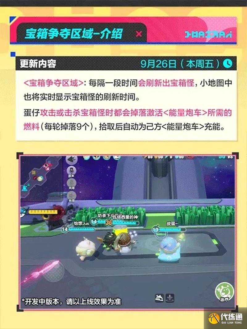 宝箱争夺区域则是蛋仔们获取能量炮车燃料的地方。每隔一段时间会刷新出宝箱怪,小地图中也将实时显示宝箱怪的刷新时间。蛋仔攻击或击杀宝箱怪时都会掉落激活能量炮车所需的燃料,拾取后自动为己方能量炮车充能。