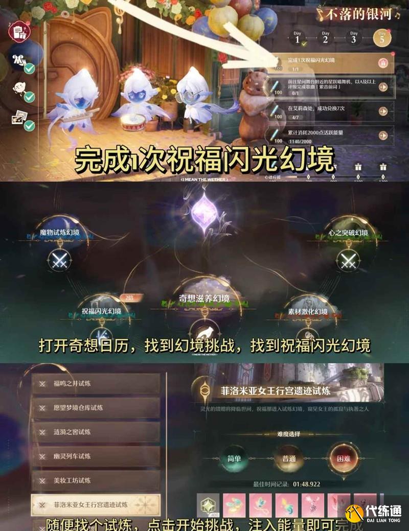 打开奇想日历,找到幻境挑战,找到祝福闪光幻境,进去随便找个试炼,点击开始快速挑战,注入活跃能量即可